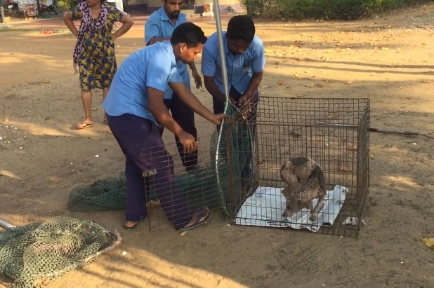 With the net covering him, a cage was bought from the van and little pup was cajoled into it and then this was carried and placed into the back of the GAWT van.