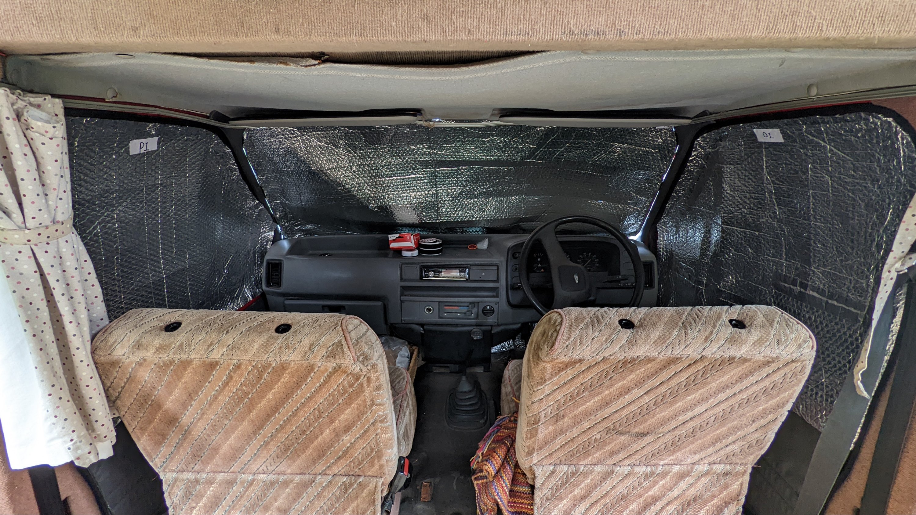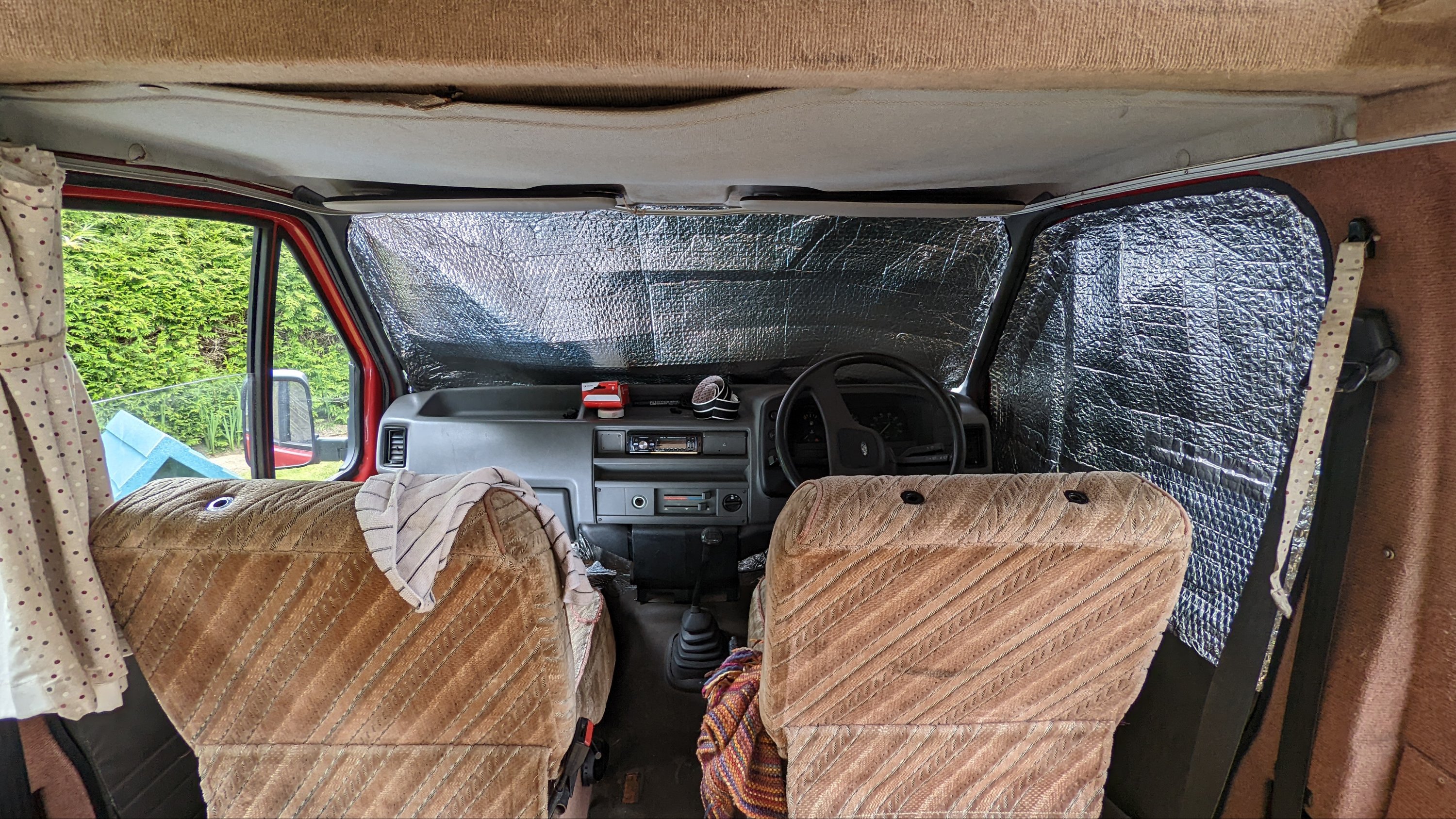 I purchased another roll of foil insulation for the windows. I cut them all to size and edges them off neatly with foil tape. I couldn’t figure out how to attach them to my windows on a more permanent basis, so I came up with a more temporary measure for the time being. I used adhesive Velcro strips, which, whilst looking a little crude around the windows, certainly does the job for this year! Having tried and tested the method this year, so far I can report that it works! When I heat my van, the van stays toasty. Yay! Just what I wanted.
